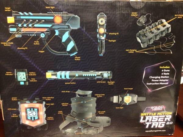 Squad Hero laser tag set- 4 guns, charging station Battle Action 2.0 360degree combat sensors, real time LCD stats 150 foot range Infrared technology, beam is not visible 2 sets available $45 each